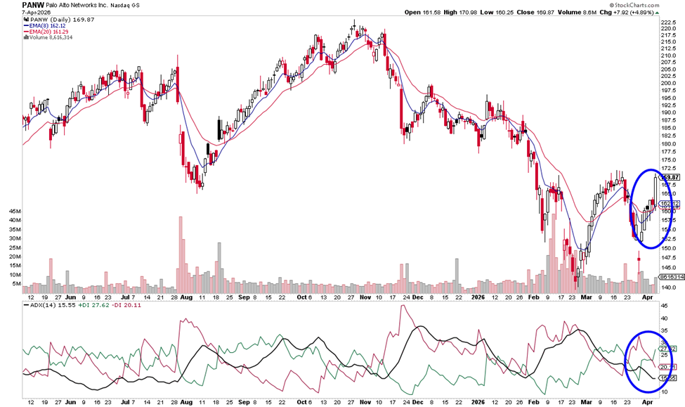 PANW is showing a short-term bounce within a broader downtrend, with price reclaiming the 8 EMA and testing the 20 EMA from below. The recent move higher looks like a relief rally after a sharp selloff, but the trend structure remains bearish unless price can break and hold above the $170–175 zone.