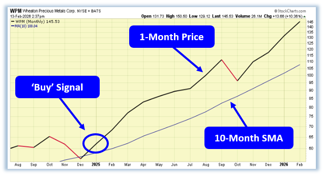 That backdrop brings us to WPM: Wheaton Precious Metals Corp. The stock has carved out a series of fresh all-time highs and remains firmly above all key trend measures, but what truly separates it is the structural signal beneath the surface: its 1-Month Price is trading above the 10-Month SMA, triggering a PowerTrend “Buy” that first appeared in January ’25 and has strengthened ever since. For trend-driven traders, that alignment signals sustained institutional accumulation rather than a fleeting surge. In a sector already benefiting from the ongoing gold bull market, this kind of multi-month confirmation stands out.