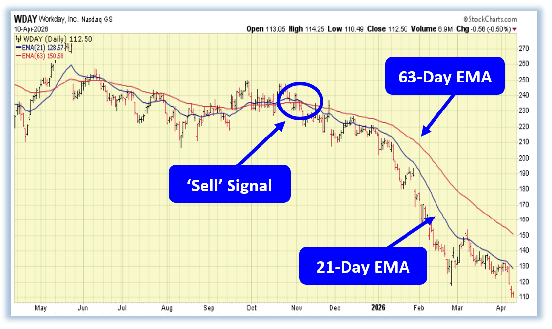 Pressure across the software industry hasn’t let up, and the market continues to reflect steady institutional de-risking as rallies stall and breakdowns extend. What once led the market higher has now turned into a source of funds, as investors reassess long-duration growth in the face of accelerating AI disruption. That shift is now showing up clearly in the charts—and Workday, Inc. (WDAY) is a standout example. The stock has broken to fresh multi-year lows and is now approaching levels last seen during the 2020 drawdown, underscoring how severe this trend has become. It remains deeply off its highs, locked in a persistent downtrend that has yet to show signs of stabilization. Technically, the key signal came back in November when the 21-day EMA crossed below the 63-day EMA, triggering a Profit Surge Sell signal that has remained firmly intact. Rather than weakening, that signal continues to assert itself as downside pressure stays firmly in control—and that presents a compelling bearish trade opportunity for this stock.