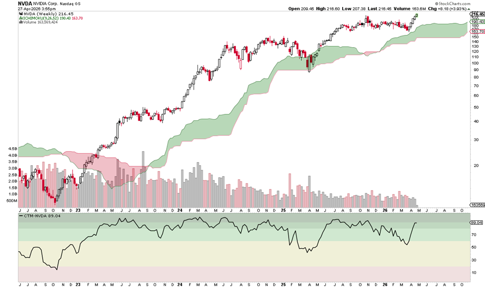 NVDA is breaking out to fresh highs while staying firmly above the rising Ichimoku cloud, which signals the longer-term uptrend remains intact.