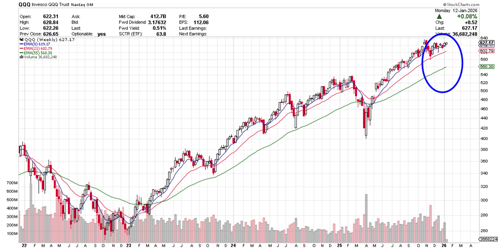 In this example, you see that the EMA’s are in the correct order however there is the slightest curl down and red candles. This may indicate a change in direction. During times like this it’s okay to wait for a more solid indication of direction. We will wait until next week to see which direction QQQ goes.