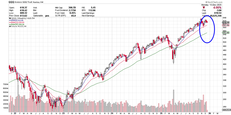 In the highlighted area above, we see that QQQ is moving UP. If the price ROSE to $611 you could consider a CALL trade. $618 is the short-term target.