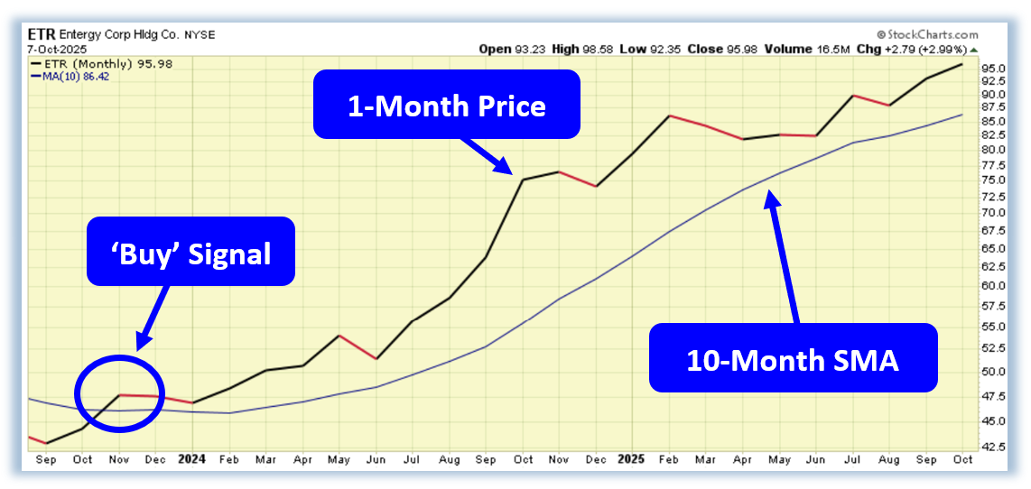 What really made me stop and take a deeper look, though, wasn’t just the story—it was the chart. ETR’s technical picture is nothing short of impressive. The stock isn’t just trending higher—it’s dominating every major trendline on the board. From the 50-day to the 200-day moving average, the price action is stacked beautifully above each one, showing a clean, orderly advance that speaks to conviction buying. But the most powerful confirmation comes from a longer-term signal that’s been quietly flashing “Buy” for months: the 1-month price remains firmly above the 10-month SMA—and has been since November ‘23. That kind of persistent strength is rare, and it tells me this uptrend isn’t just holding… it’s building momentum. When you see a setup where the fundamentals and the technicals are marching in lockstep like this, you’re not just looking at another trade—you’re looking at a trend with real staying power.