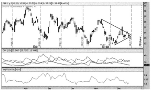 The next step is to measure the “mouth” of the wedge to gain an expected price target – bullish and bearish – for this stock. It won’t be possible to gain an exact measurement from the picture of the chart (you will be able to do so in your charting platform), yet a rough measurement will work for the purpose of learning here. The “mouth” of the wedge is about $4.50. With the stock currently trading at a price around $33.50, the bullish target would be $38.00 and the bearish target at $29.00.