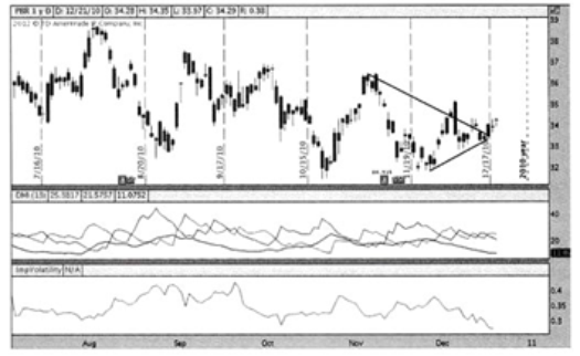 Below is chart of the stock PBR that has formed a wedge pattern. The wedge pattern has been added to help develop and train your eye to seeing it on the chart.