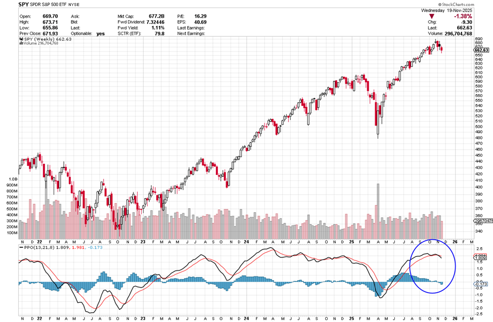 Looking at a weekly chart to get the bigger picture the trend is holding on but the recent pull back shows the momentum of the trend starting to wind down. Even if NVDA can give the broader market a short term lift, sign are showing the rally running out of steam. We can see that more clearly on the Percentage Price Oscillator or PPO at the bottom of the chart. When the lines in the PPO cross it is a telling signal, we can use to find a trade. To get more information on the PPO, click here.