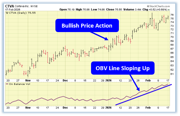 CTVA (Corteva Inc.) fits that description cleanly. After carving out a decisive bottom last October–November, shares have marched higher in a well-defined series of higher highs and higher lows, with major trendlines now aligned in bullish fashion and triggering key technical buy signals. What stands out most is the rising On-Balance Volume (OBV) line alongside the advance, signaling persistent institutional accumulation rather than a short-term squeeze. With price now pressing toward prior all-time highs, the structure suggests a trend built on sponsorship, not speculation.
