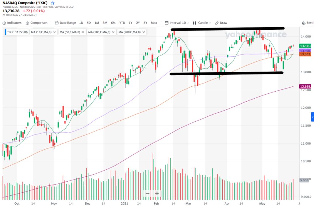 With the NASDAQ showing potential upward momentum and a pretty clear range established, it shows that it has the potential to get back up to the top of that range.