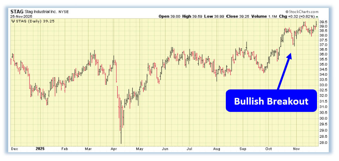 That strength is exactly why Stag Industrial Inc. (STAG) is on my radar today. While the broader real estate space has been choppy, this stock has continued to carve out a remarkably clean technical structure, powering into a fresh sequence of higher highs and higher lows that traders simply can’t ignore. The relative outperformance has become even more pronounced in recent sessions, with STAG breaking above key resistance levels and refusing to give back ground even on weaker market days. It’s the kind of behavior you typically see when momentum is shifting decisively in favor of the bulls and when a breakout has far more behind it than just short-term noise. With the trend accelerating and price discovery unfolding in real time, STAG is flashing one of the clearest bullish signals on my screen right now, and it’s a move worth watching closely.