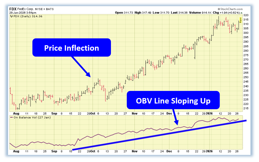 One name fitting that profile right now is FedEx (FDX). The stock continues to trade above its key short-, intermediate-, and long-term moving averages, reinforcing a well-defined uptrend that has already carried it to multiple new 52-week highs. What stands out most, however, is the behavior of On-Balance Volume: OBV began curling higher back in September and has remained in a steady ascent ever since, signaling consistent institutional accumulation. Price followed shortly after, and the fact that OBV continues to trend higher suggests demand remains active rather than exhausted.