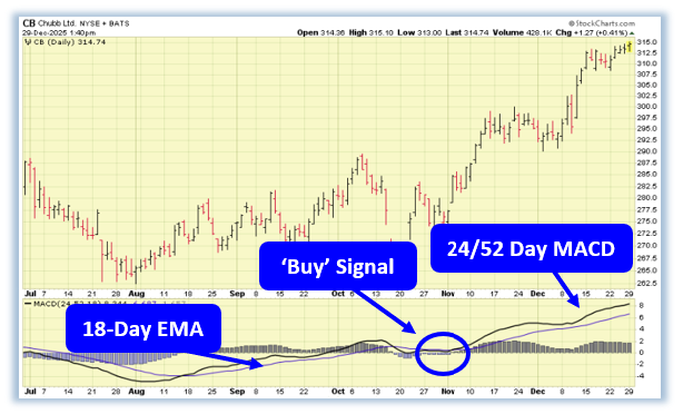 That leadership becomes even clearer when you zoom in on Chubb Ltd. (CB). Beyond the steady march to new highs, the chart is now flashing a high-confidence momentum confirmation that historically accompanies sustained advances. CB’s 24/52-day MACD has decisively crossed above its 18-day exponential moving average, signaling that upside momentum is no longer grinding higher — it’s accelerating. This is the kind of technical alignment that suggests buyers are firmly in control, reinforcing the broader uptrend rather than chasing a late-stage move. When a stock already pressing fresh highs sees momentum indicators re-ignite like this, it often marks the beginning of the next leg higher, not the end of the current one. In a market rewarding discipline and trend persistence, CB’s setup stands out as both timely and technically compelling.